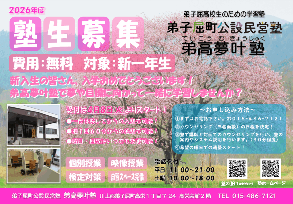 そして弟高夢叶塾では新一年生の入塾募集を行っています!