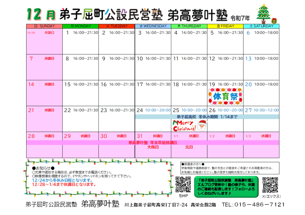 12月は28日(日)~1月4日(日)まで年末年始休講日です!