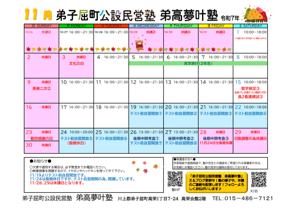 テスト前自習開放期間や、休講日がありますのでご確認をお願いします!